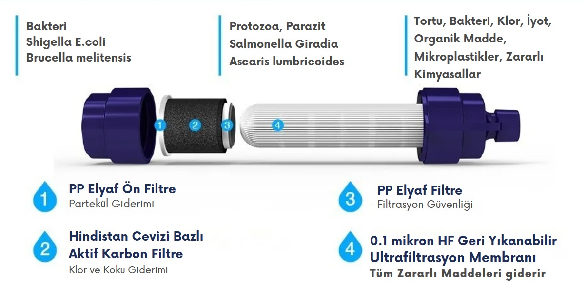 Su arıtma pipeti, PP elyaf ön filtre, değiştirilebilir Hindistan Cevizi Bazlı Aktif Karbon filtre bölümü, ikinci PP elyaf filtre ve içten dışa filtrasyon yapan HF UF membran teknolojisi ile donatılmış, dört aşamalı bir kartuşa sahiptir. Bu kombinasyon, hızlı su akışı, uzun ömür ve üstün geri yıkama performansı sunar.